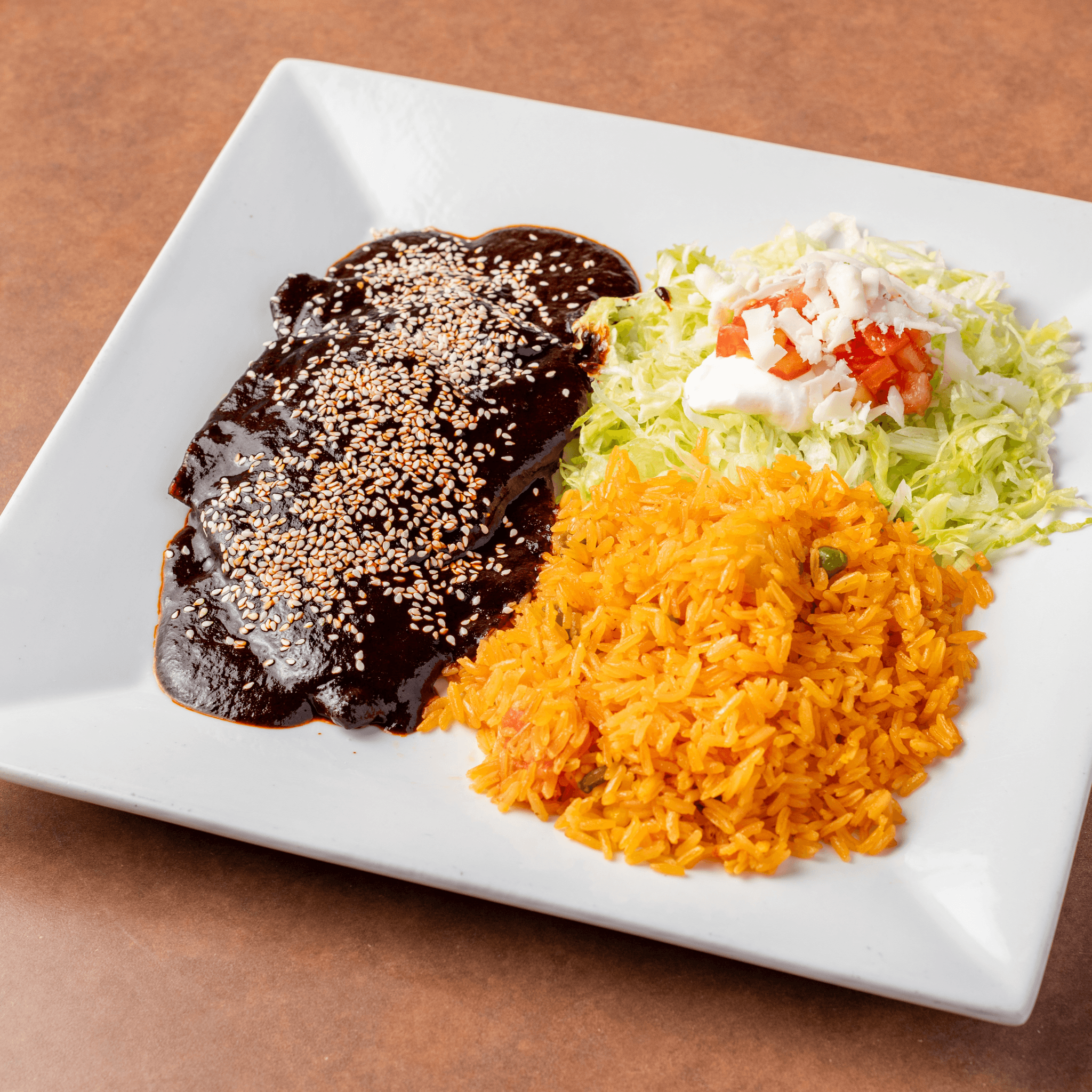 Four shredded chicken enchiladas topped with mole poblano sauce. Served with rice and beans