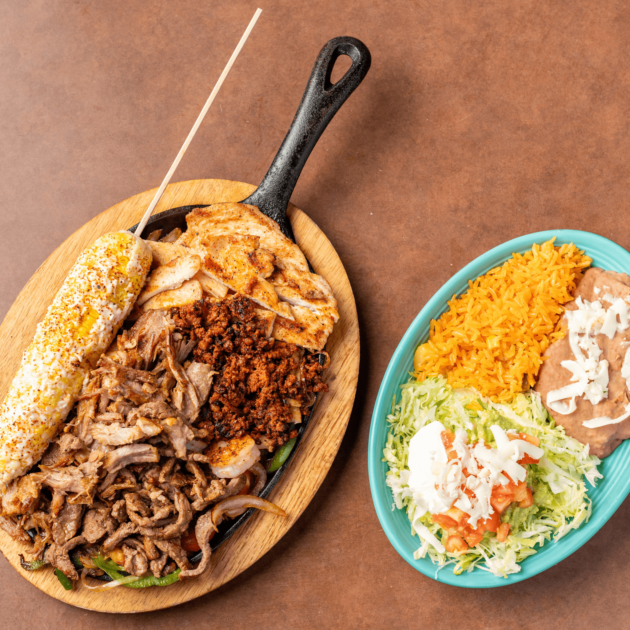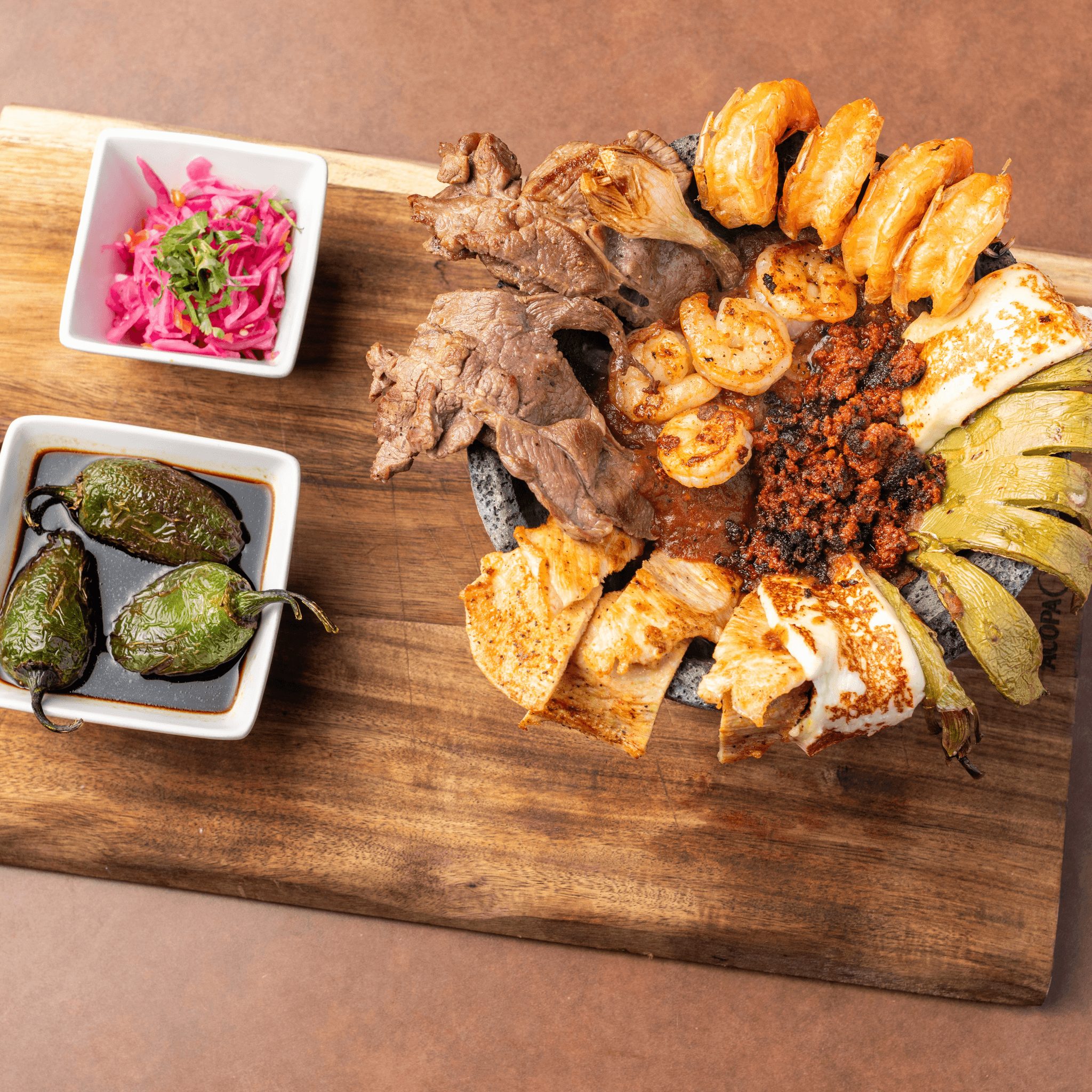 Popular. A traditional feast for all!!! A sizzling lava stone bowl filled with steak, grilled chicken, shrimp, chorizo, cactus, cambray onions, fresh supreme cheese and special mild salsa. Served with rice, beans and tortillas