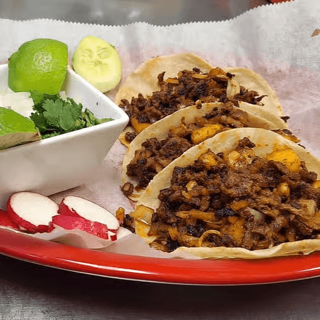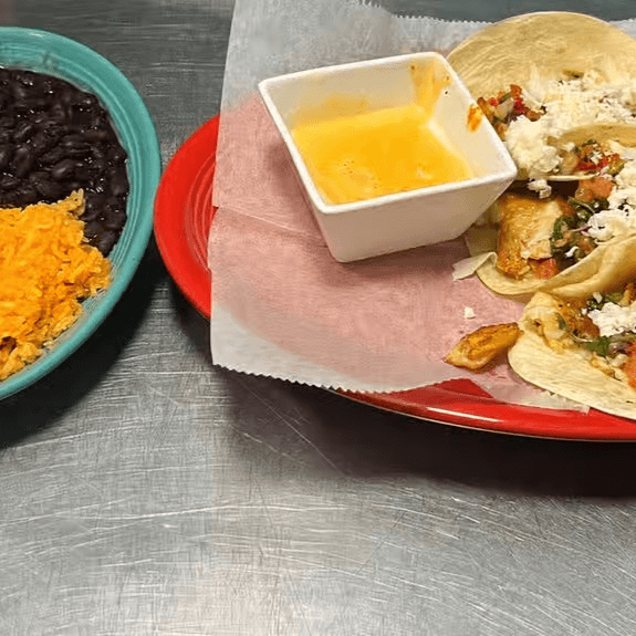 Three corn tortillas topped with your choice of meat, cilantro and onions. Served with rice and your choice of refried beans or black beans
