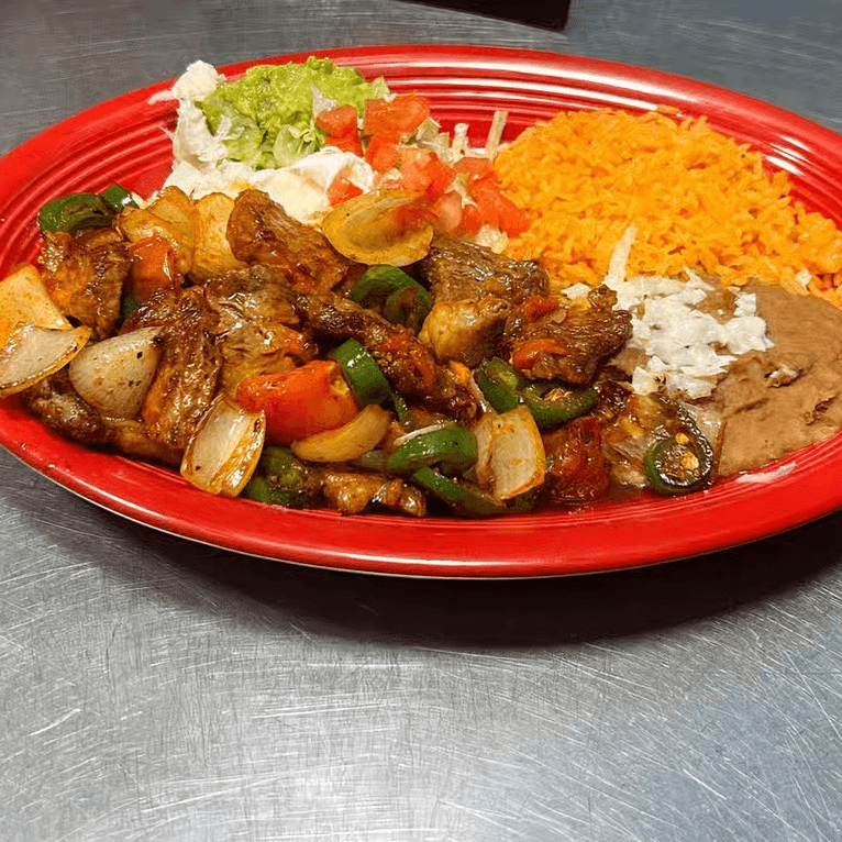 Steak cut into pieces, cooked with grilled onions, tomatoes, grilled jalapenos. Served with rice, refried beans, regular salad and tortillas