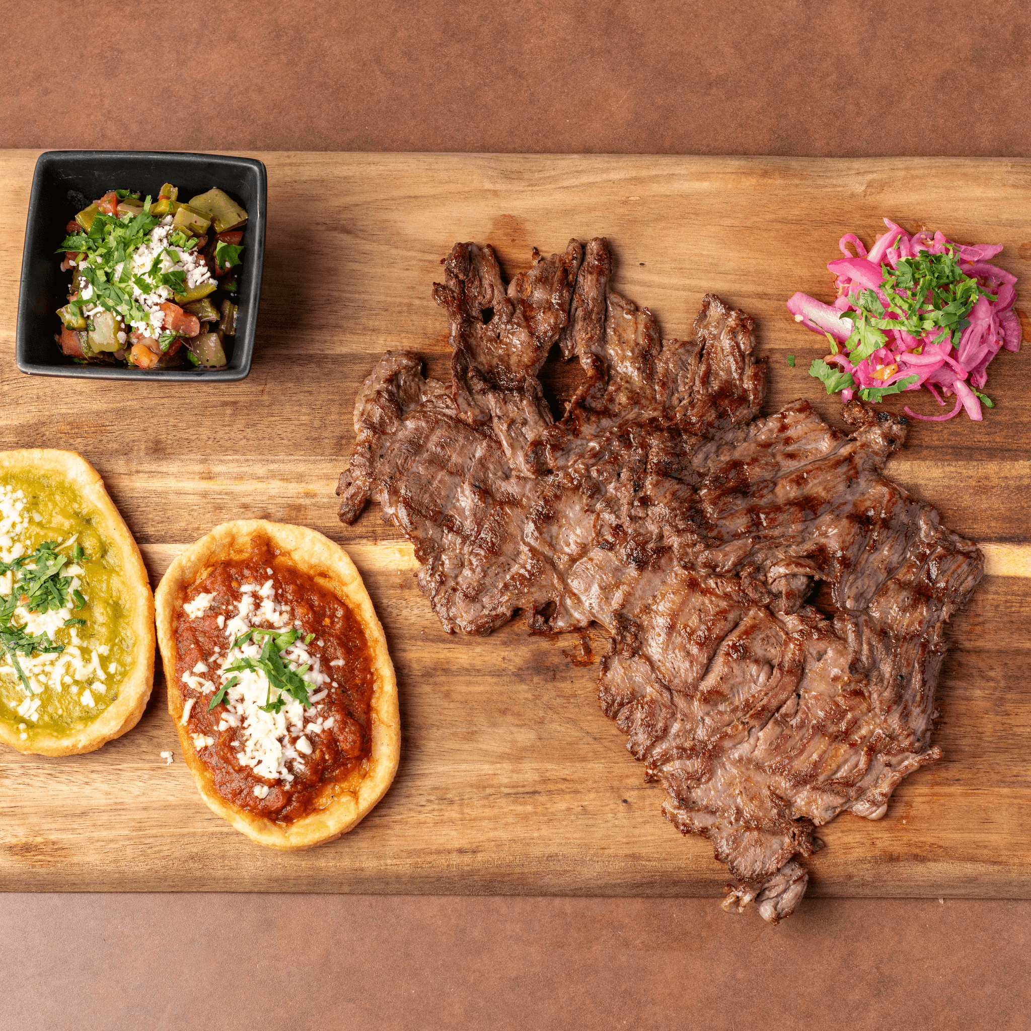 A skirt steak cooked to perfection. Served with two homemade huaraches with green and red hot sauce, cactus salad, red pickled onions and tortillas
