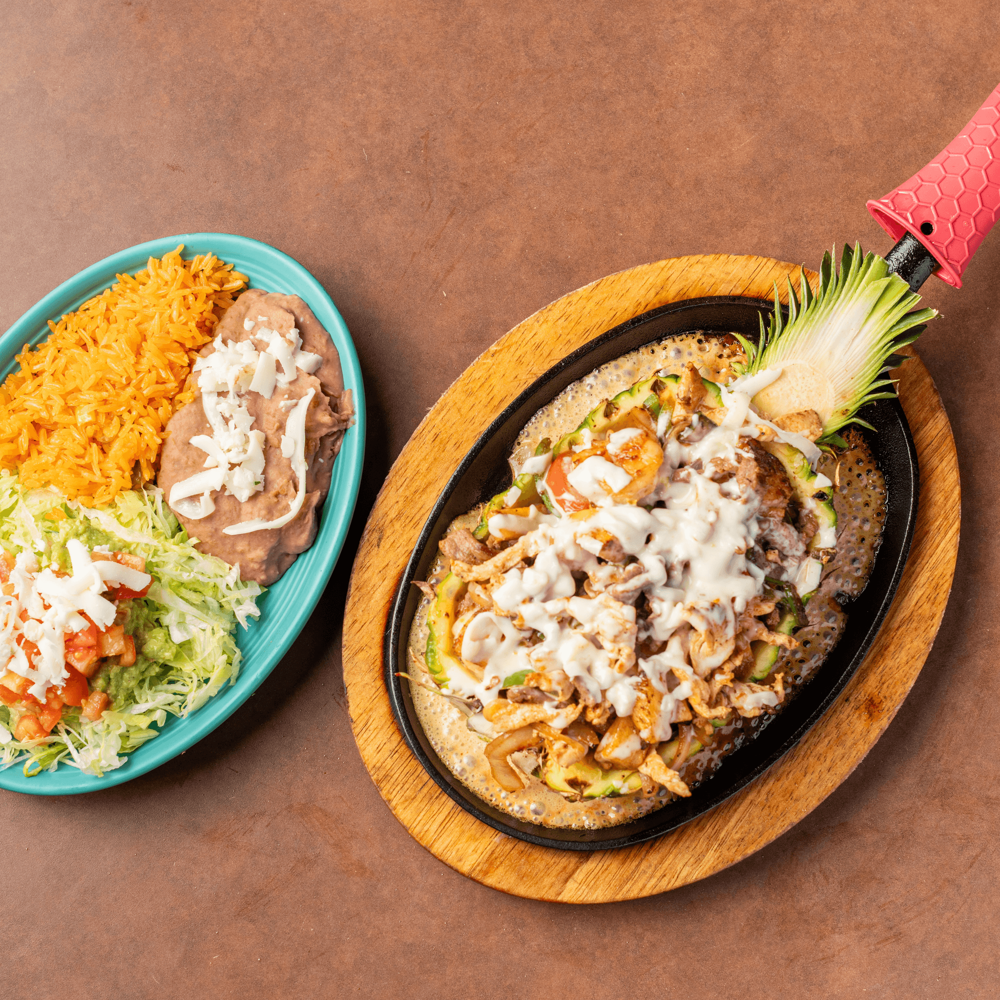 Half pineapple base topped with grilled chicken, steak and shrimp cooked with bell peppers, tomatoes, grilled onions, covered with pineapple and cheese dip. Served with rice, beans, regular salad and tortillas