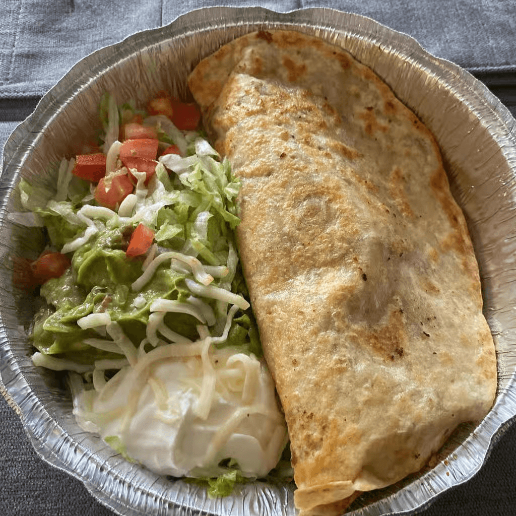 An extra-large flour tortilla folded and filled with cheese, your choice of grilled chicken or steak, grilled onions, Mexican sausage. Served with regular salad