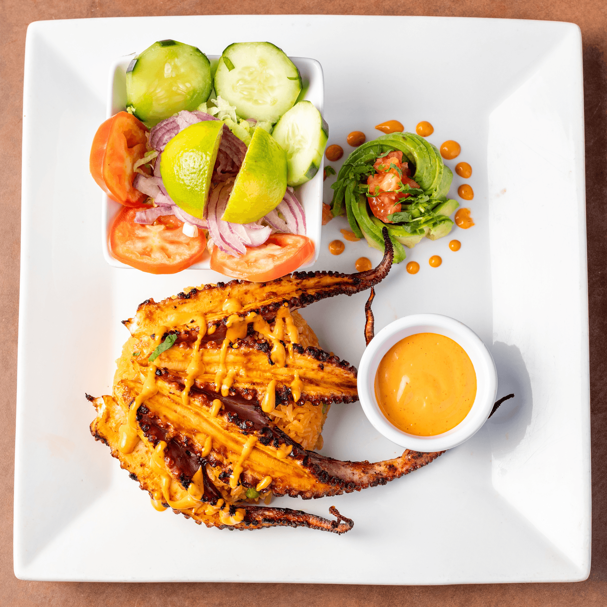 Rib eye & grilled shrimp topped with mushrooms, grilled onions, poblano pepper and pineapple. Served with rice, guacamole salad and tortillas. Topped with habanero sauce