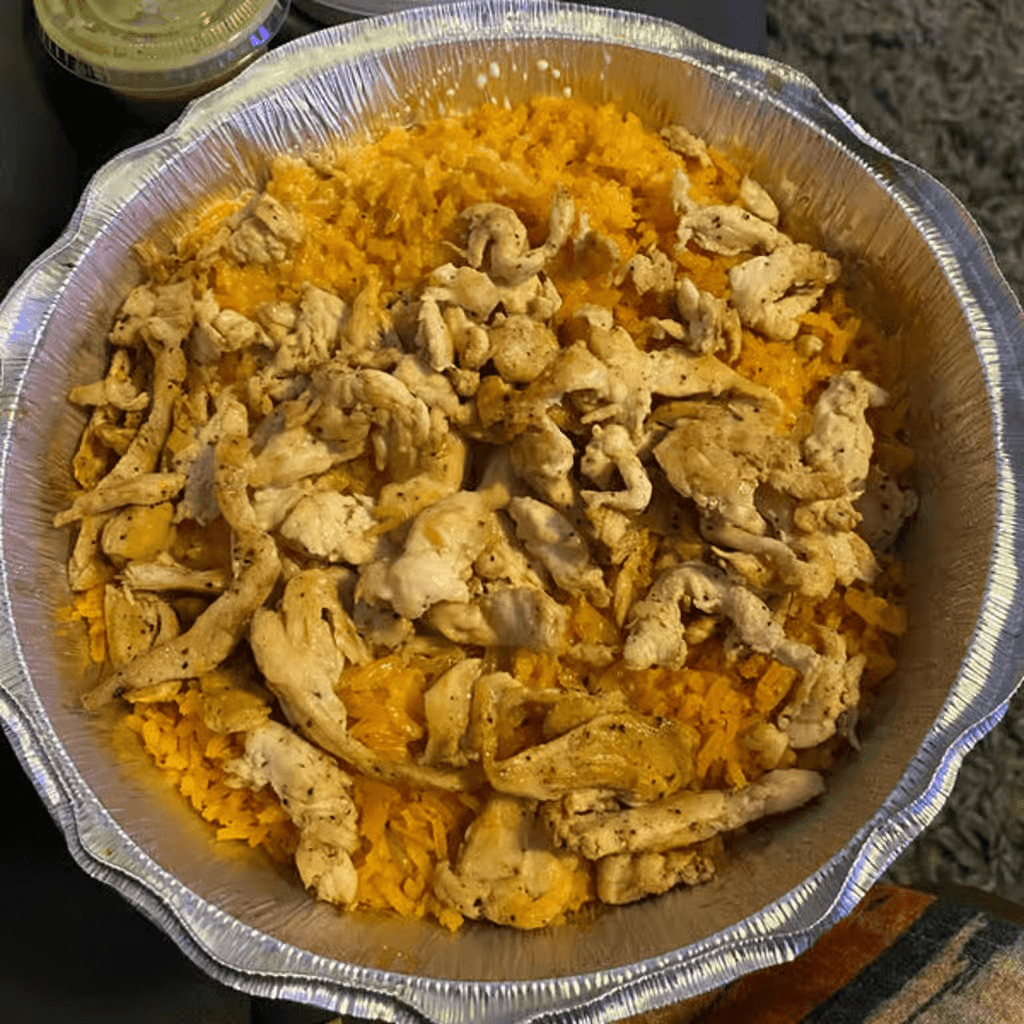 Rice topped with grill chicken, steak strips, shrimp and cheese dip