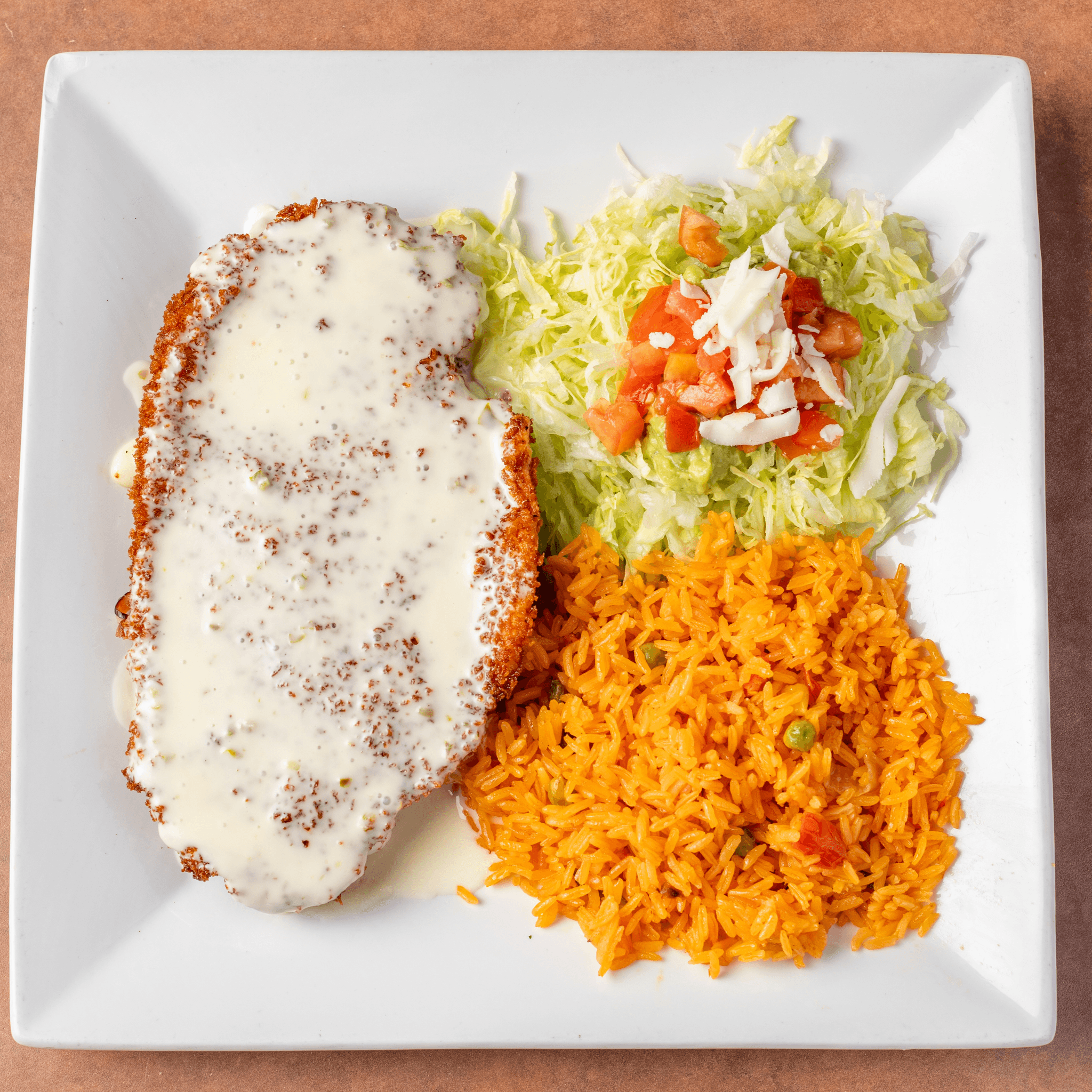 Popular. Grilled chicken breast, served with refried beans, rice, crema salad and tortillas. Topped with cheese dip