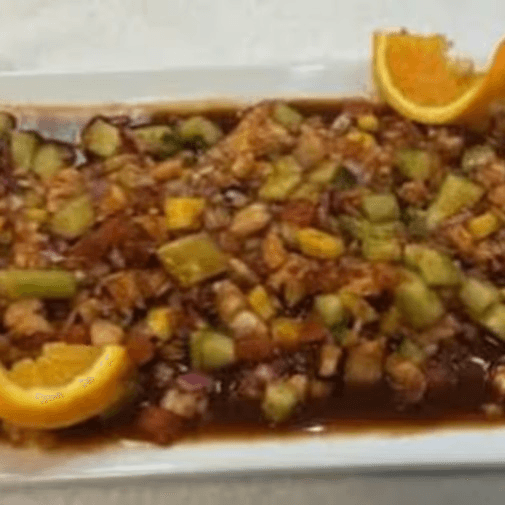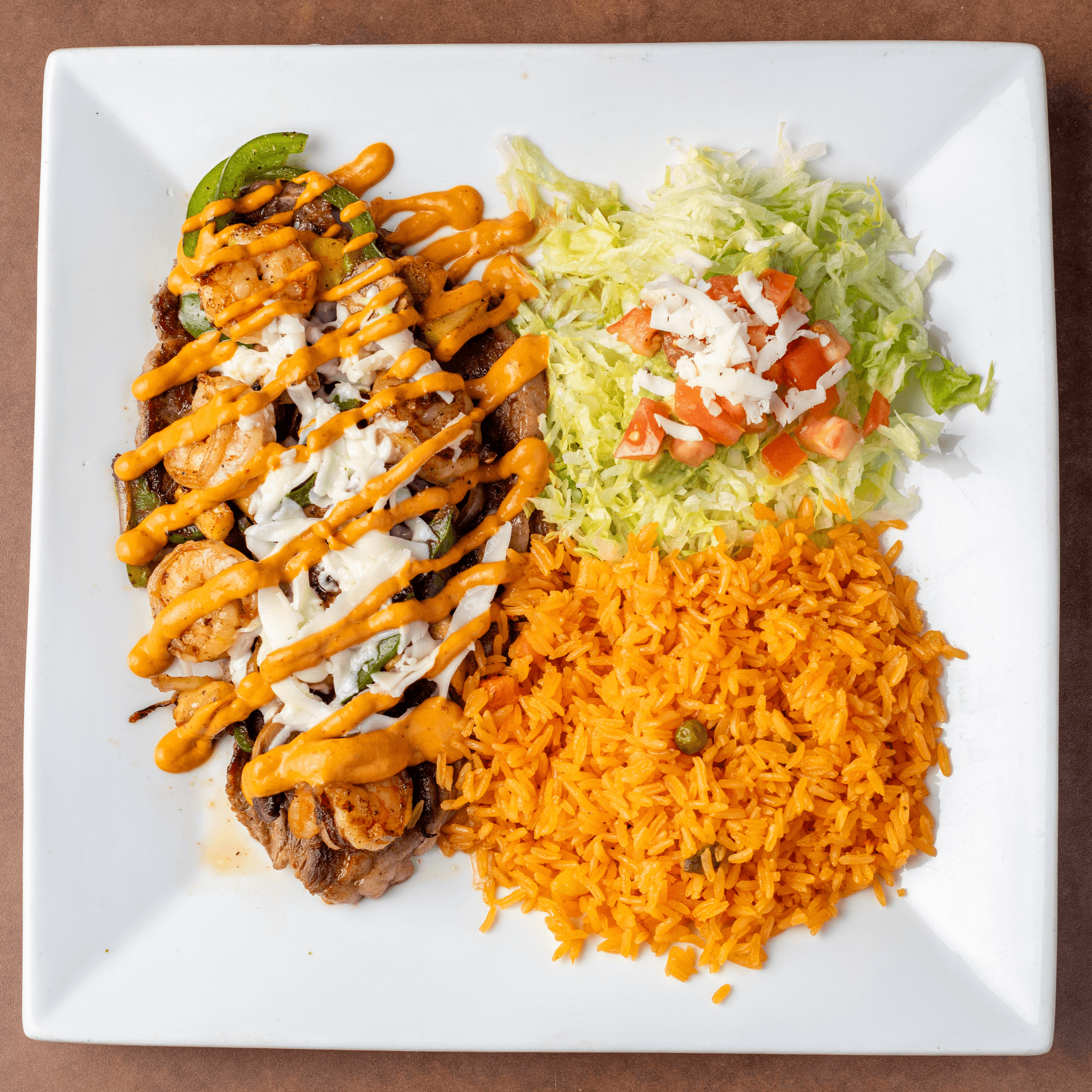 Grilled chicken strips, grilled steak strips and shrimp cooked with grilled onions, grilled jalapenos. Topped with bandera sauce