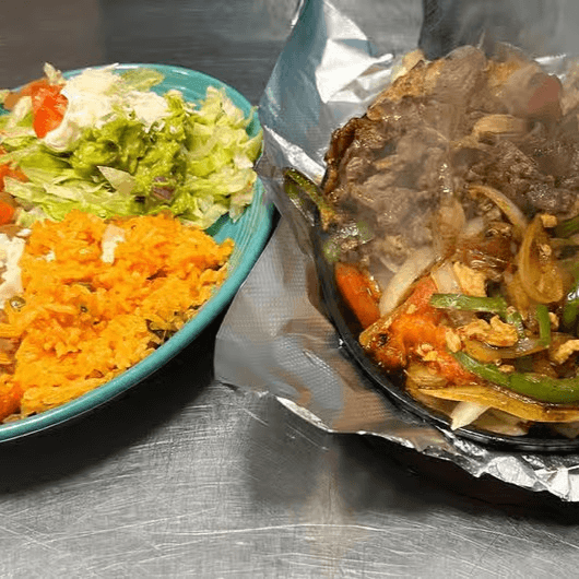 Grilled chicken or steak. Cooked with bell peppers, tomatoes and onions. Served with rice, beans, regular salad and tortillas