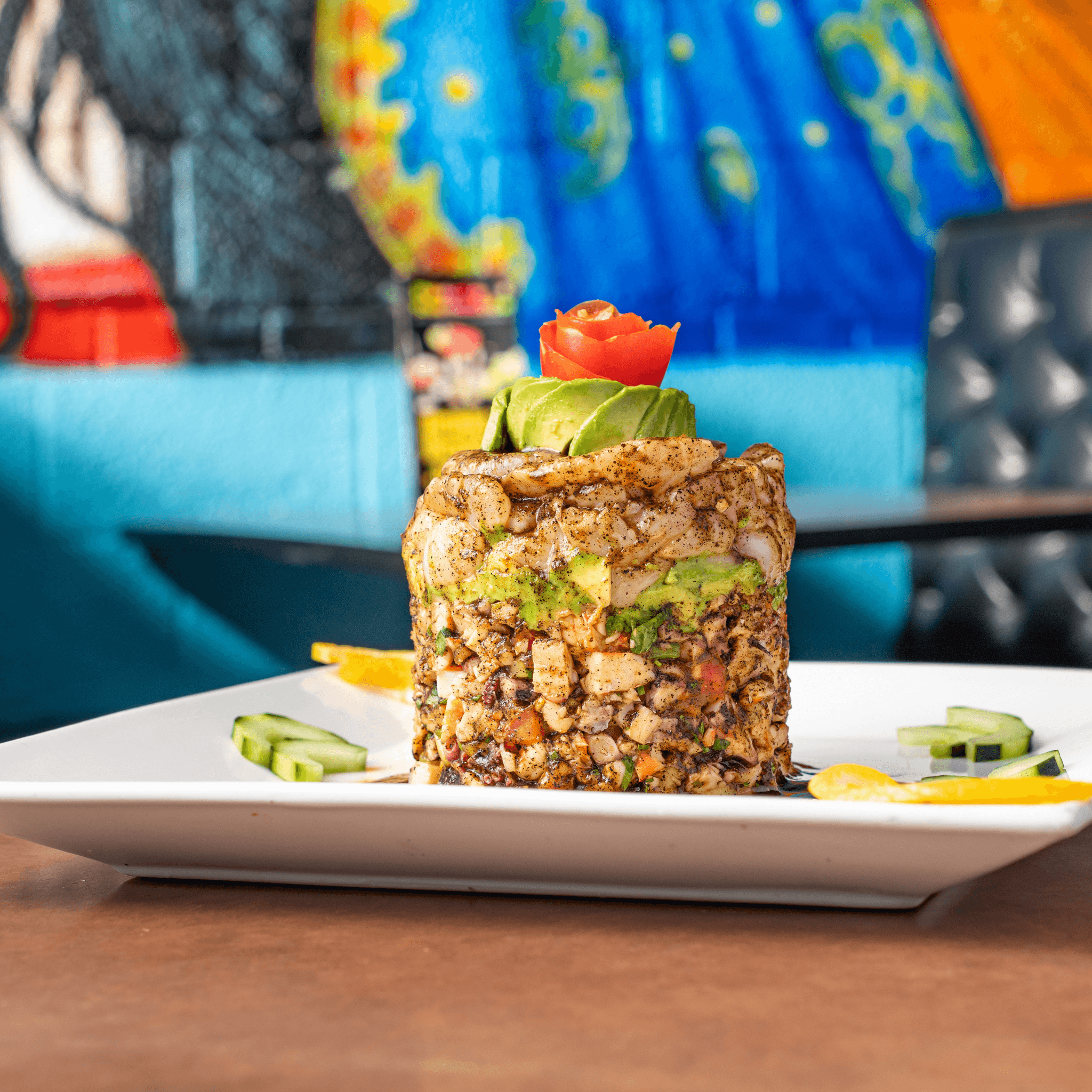A grilled shrimp chimichanga stuffed with grilled peppers, grilled onions and cheese. Served with rice and crema salad. Topped with crab meat and cheese dip