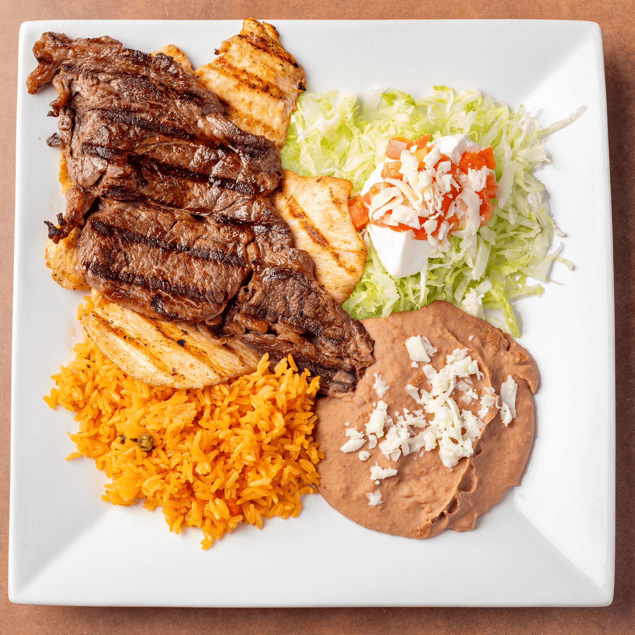 Rib-eye and grilled chicken breast. Served with rice, beans, regular salad and tortillas