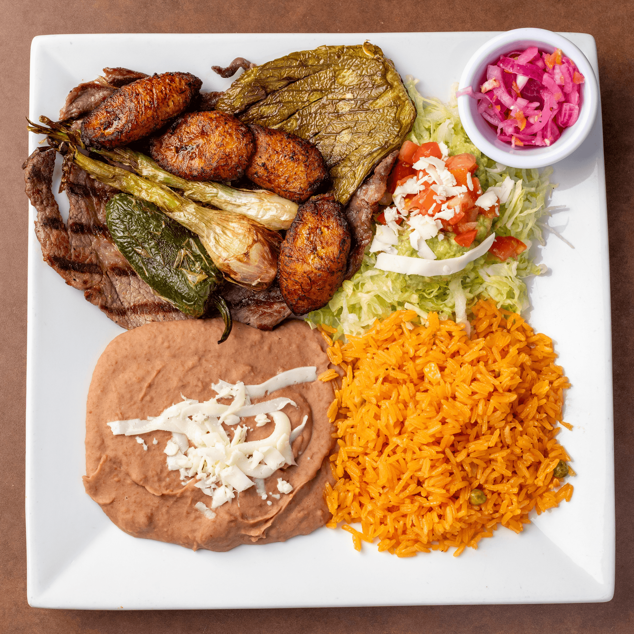 Rib eye topped with chorizo, cheese dip. Served with rice, refried beans and tortillas