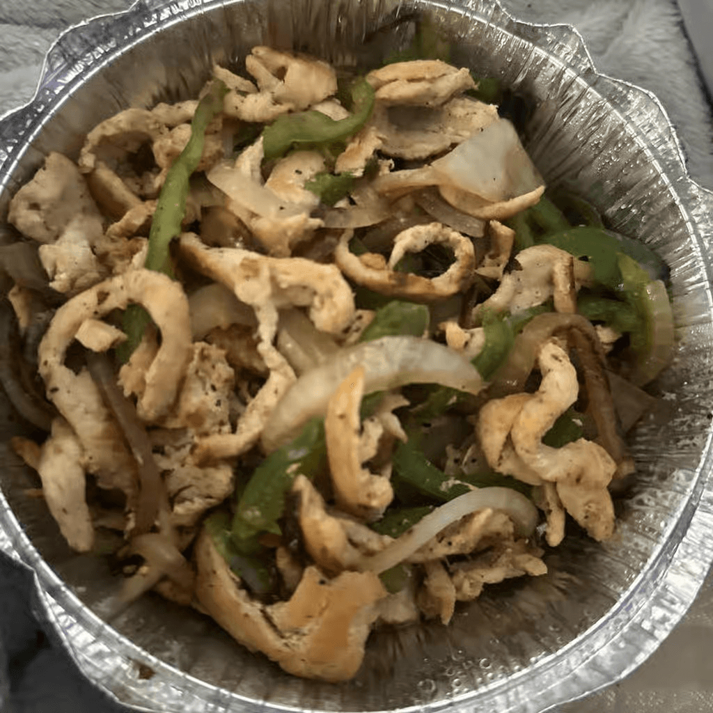 Grilled chicken or steak strips on a bed of rice. Topped with red peppers, onions, broccoli and cheese dip. Served with tortillas