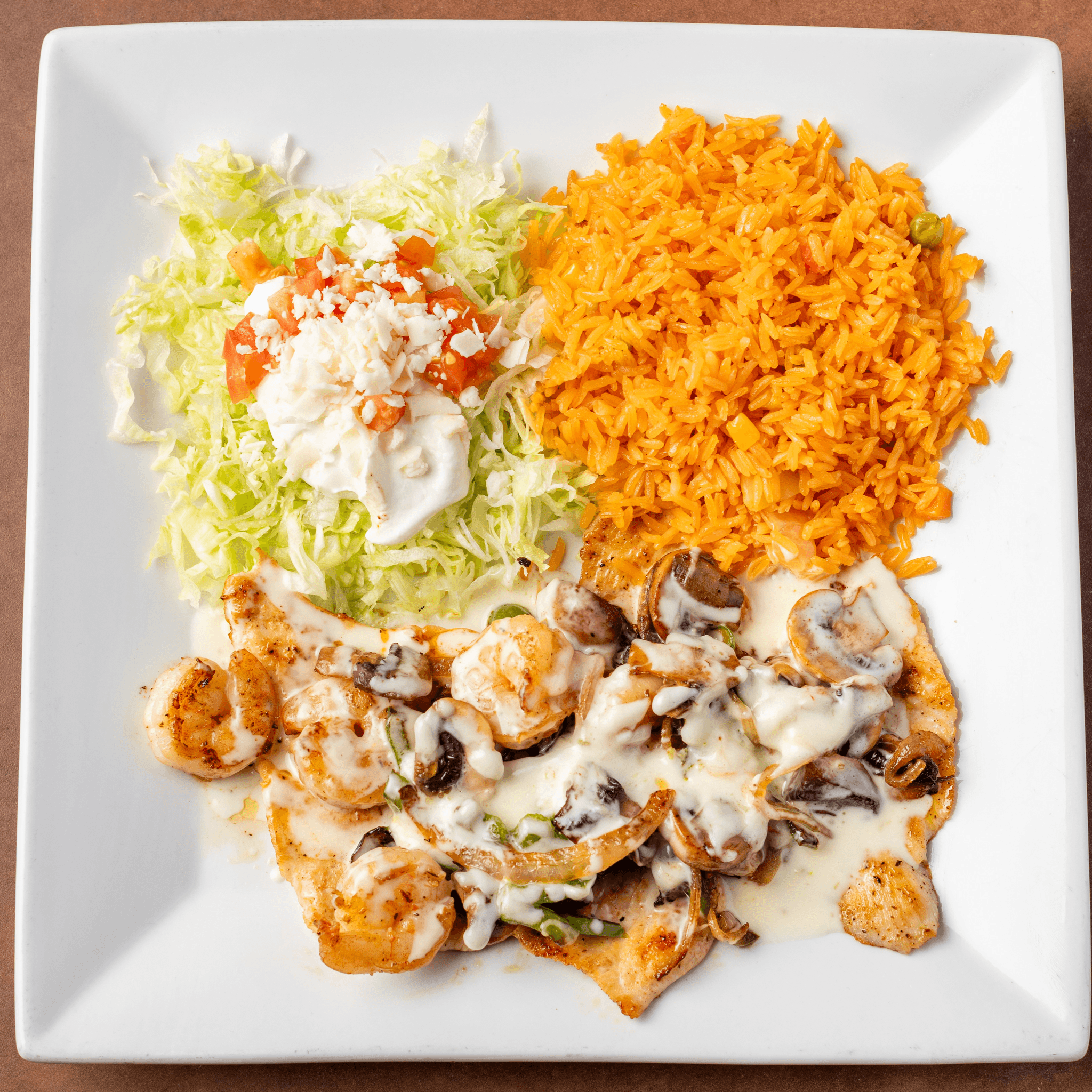 Grilled chicken breast, grilled shrimp topped grilled onions, and bell peppers, mushrooms and cheese dip. Served with rice, crema salad and tortillas