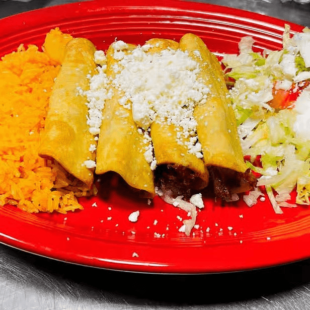 Four deep fried corn tortillas, rolled with beef tips or shredded chicken, served with rice and guacamole salad