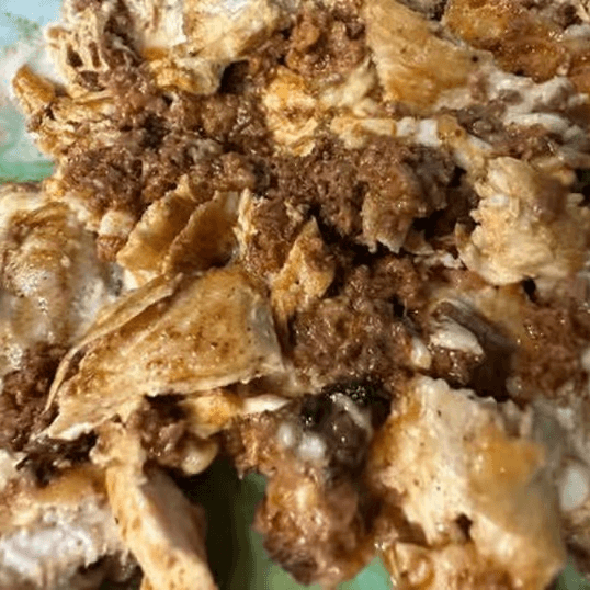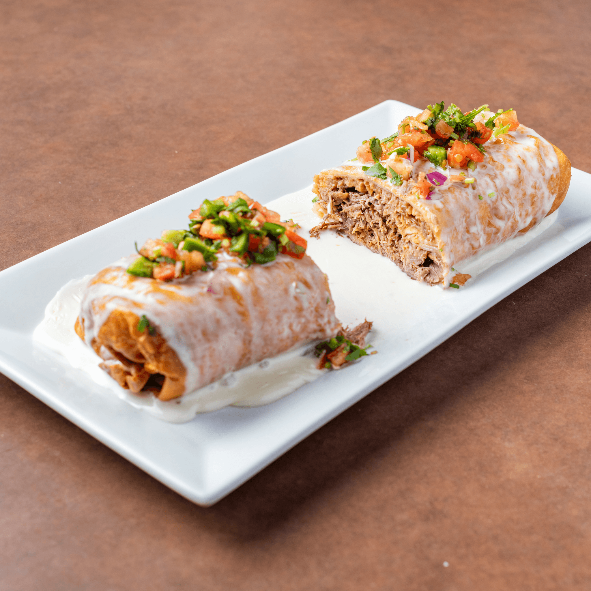 Two deep-fried flour tortillas filled with beef tips or shredded chicken. Topped with cheese dip. Served with crema salad and refried beans