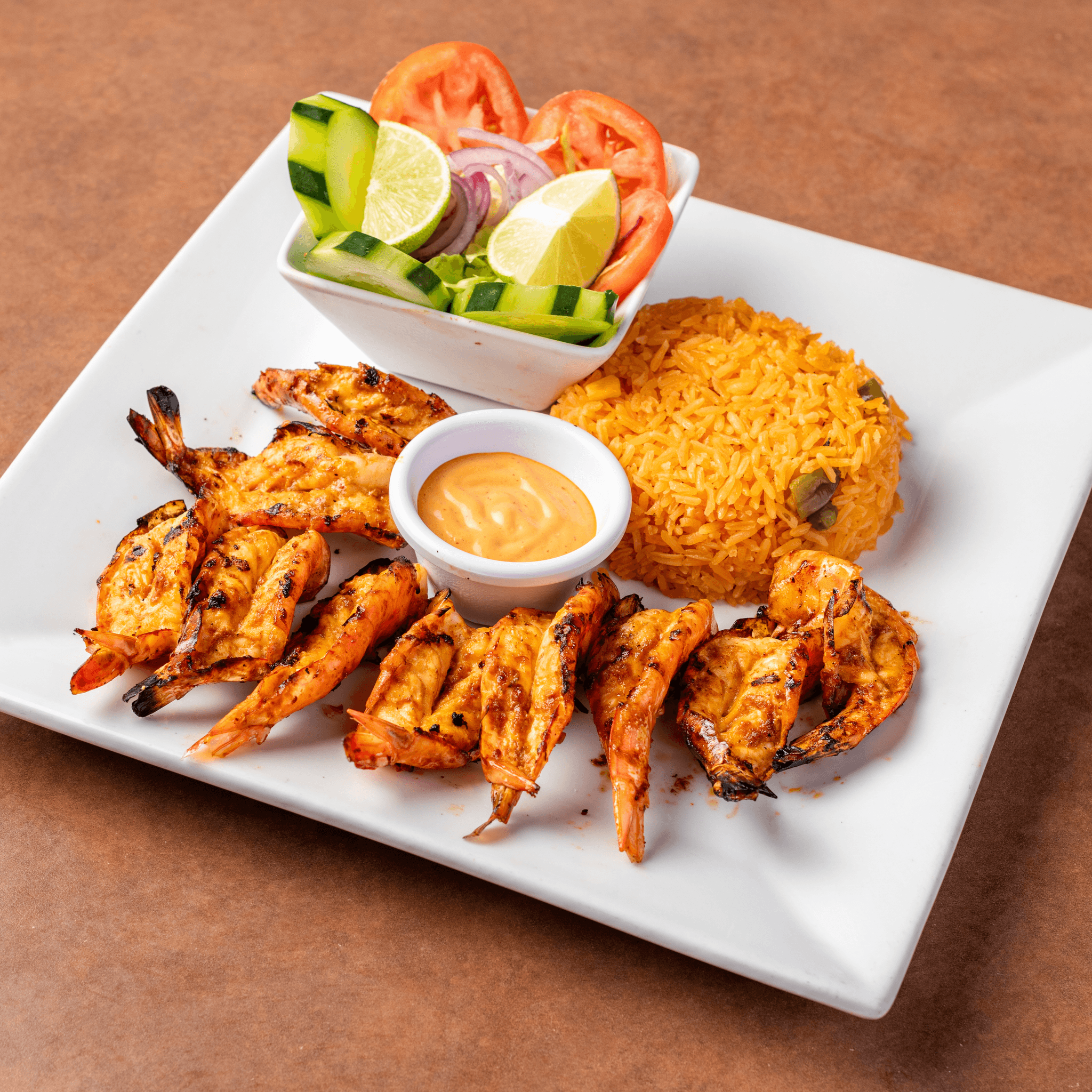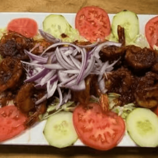 Shrimp cooked with handmade spicy sauce. Served with rice, regular salad and tortillas