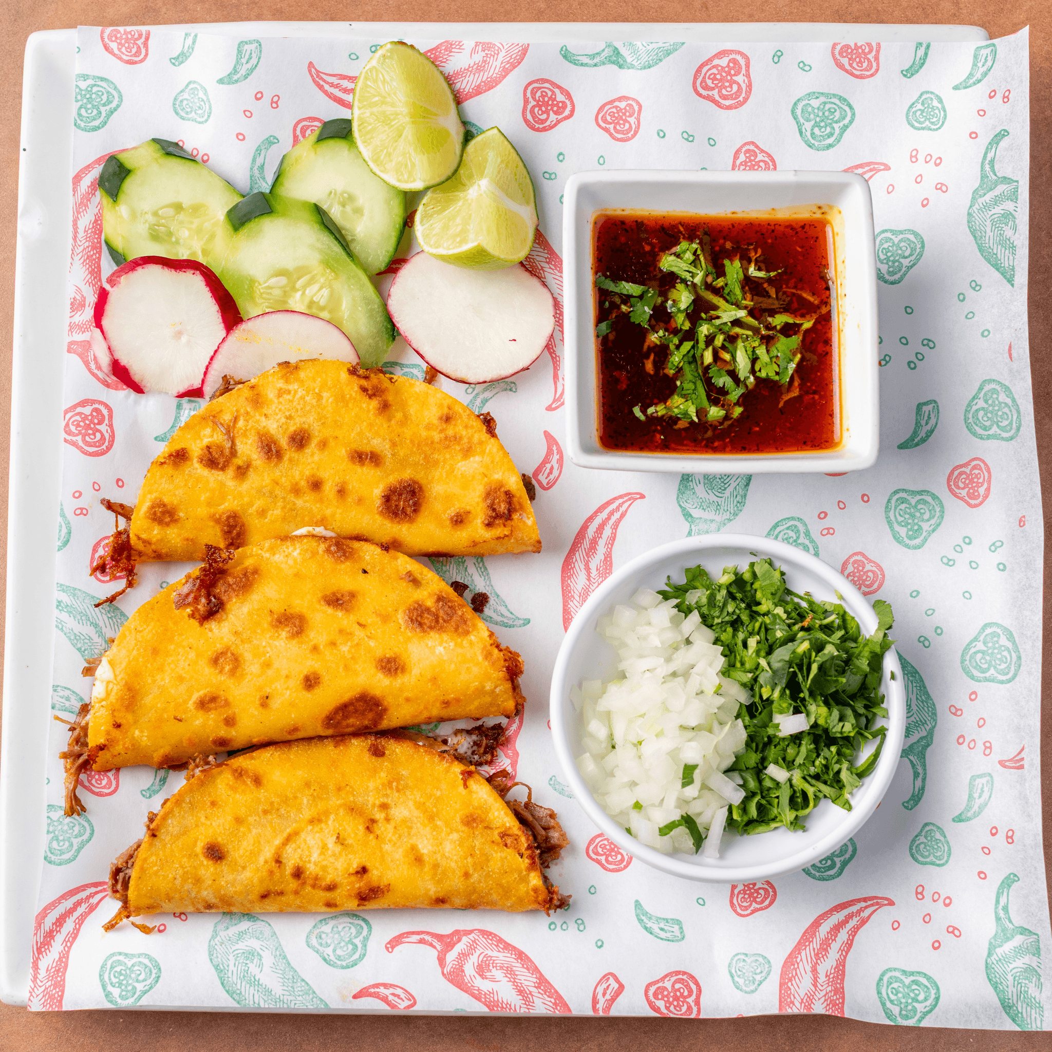 (3) birria beef style with Oaxaca cheese. Served with cilantro, onions and consommé broth