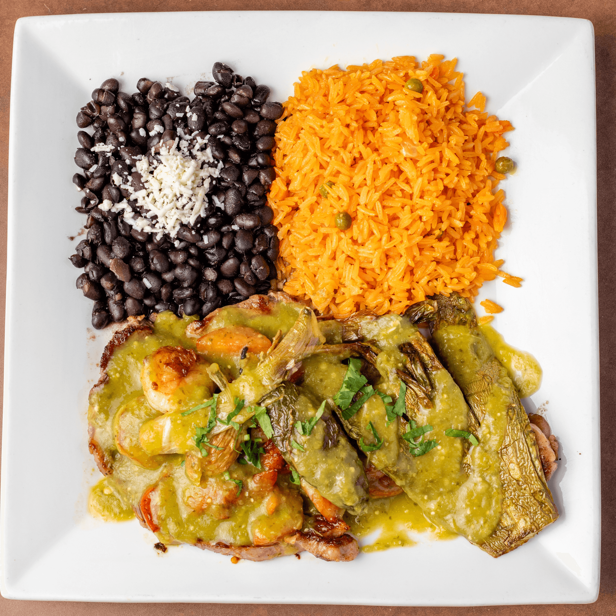A rib eye and grilled shrimp served with black beans, rice, cambray onions, grilled jalapeño, grilled cactus, grilled tomatoes and tortillas. Topped with green sauce