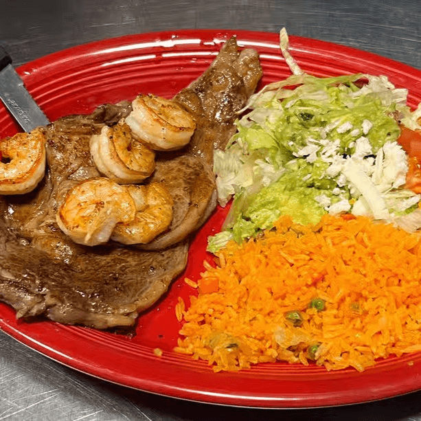 Rib eye & grilled shrimp. Served with rice, guacamole salad and tortillas